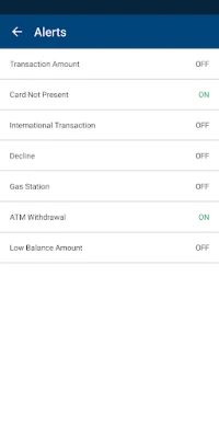 • Turn your debit and/or credit card on/off if you’ve misplaced it or for enhanced security. • Set dollar limits or block certain purchase types • Set up transaction alerts to manage debit and credit card account activity. • Check your balance and recent transactions. • Find ATM locations worldwide.