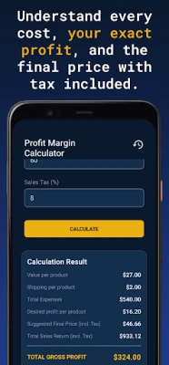 With an intuitive and practical interface, you can determine the ideal selling price to achieve your desired profit, considering product cost, quantity, shipping, and profit percentage.